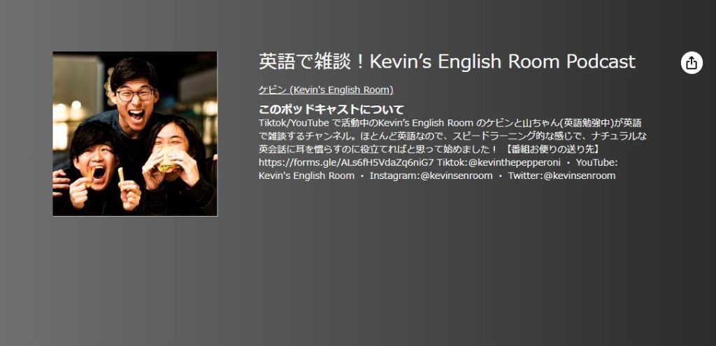 YouTubeやTikTokなどで大人気の3人組ユニット「Kevin’s English Room」のケビンさん(アメリカ生まれ・アメリカ育ち)と山ちゃんさん(英語勉強中)が、ほぼ全編英語で雑談を繰り広げる番組です。