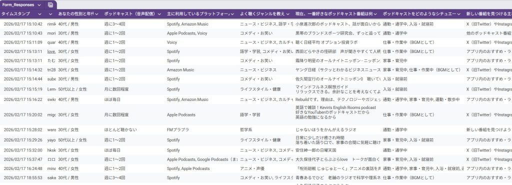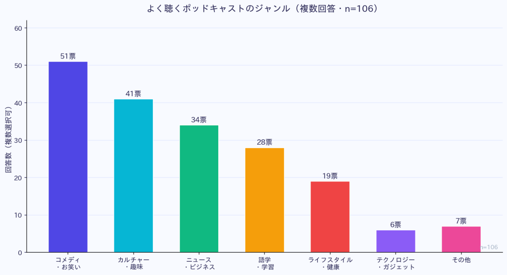 「語学・学習」(28名)の回答も目立ち、ポッドキャストを自己学習のツールとして活用する層が一定数いることもわかりました。