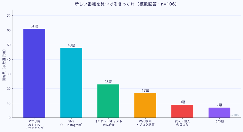 新しいポッドキャスト番組を見つけるきっかけについて聞いたところ、「アプリ内のおすすめ・ランキング」が61名で最多でした。