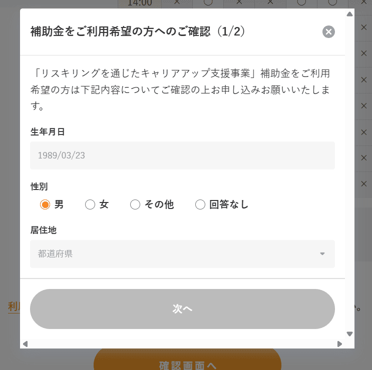 リスキリングを通じたキャリアアップ支援事業の補助金を利用したい場合は生年月日や居住地の入力も必要です。