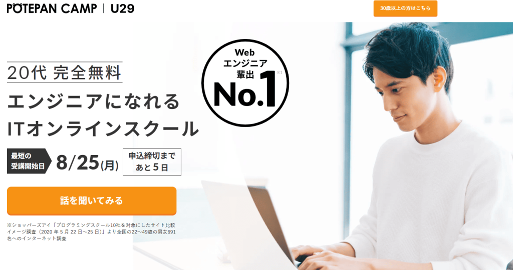 ポテパンキャンプのU-29コースは、29歳以下の方を対象にした完全無料のオンライン学習コースです。
