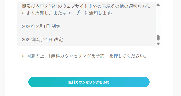 プライバシーポリシーを読み「無料カウンセリングを予約」をクリックし、申し込み完了です。