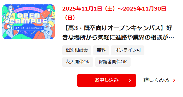 また、大学生や社会人向けに週末や夜間を利用して学べるバンタンアカデミーキャリアカレッジもあります。
