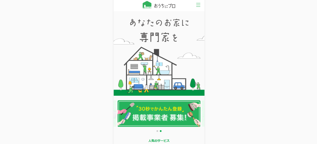 「おうちにプロ」は、エアコンクリーニングやハウスクリーニングなどの出張訪問サービスを、地域・目的別に簡単に検索・予約できるオンラインプラットフォームです。